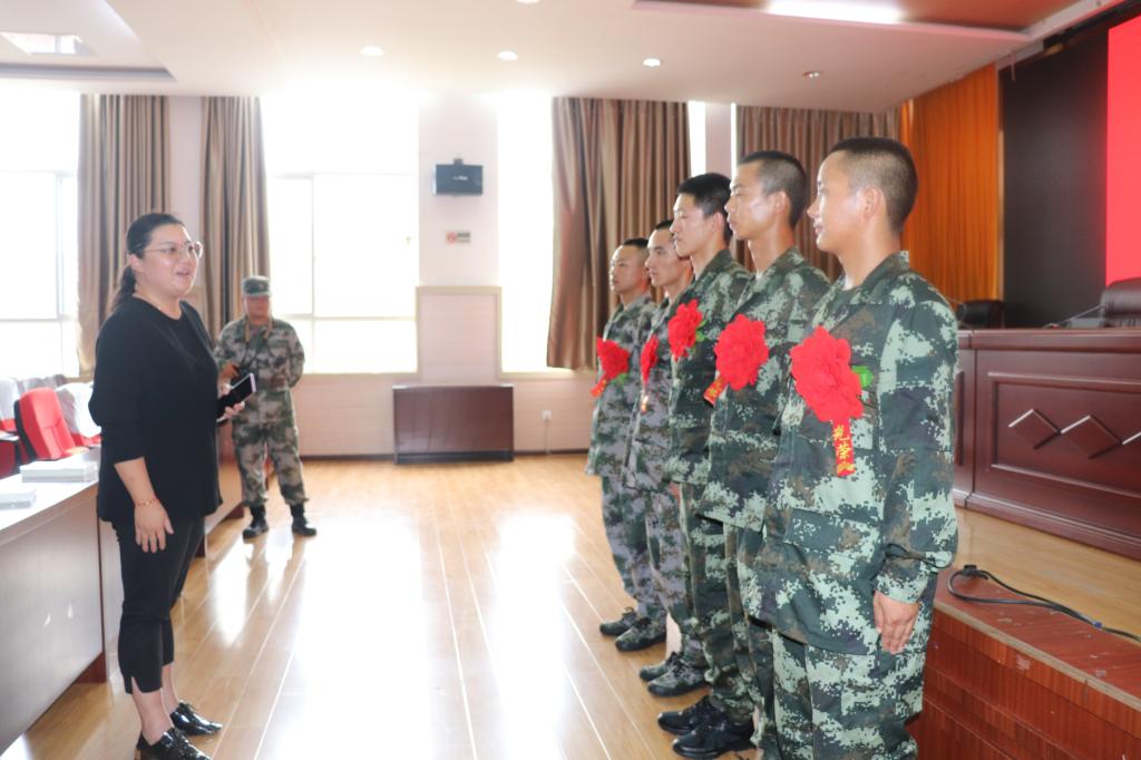 欢送仪式上,新征入伍的5名学生代表进行了自我介绍,主席台就坐的领导为新兵同学佩戴了红花,发放了《习近平治国理政第三卷》(音乐),学生新兵代表进行了发言,军协退伍老兵发表了贺词。