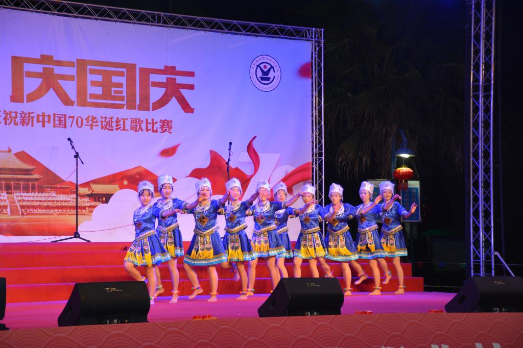 台上歌声嘹亮,台下掌声雷动。一首首铿锵有力、脍炙人口的经典红歌在校园中不断回响。晚会在蕴含青春旋律、激情岁月的舞蹈《感到幸福你就拍拍手》中拉开序幕。《我和我的祖国》《爱我中华》《我们走在大路上》《歌唱祖国》《走向复兴》《太阳最红 毛主席最亲》《光荣与梦想》《团结就是力量》《四渡赤水出奇兵》《不忘初心》《祖国颂》等一首首振奋人心的红歌带领现场观众回顾了那段激情燃烧的岁月,歌颂了中华民族自强不息的伟大精神,唱出了华夏儿女的自豪与骄傲,唱出了各民族儿女与祖国血浓于水的拳拳亲情,深切表达了云锡人对祖国的无限热爱和对新中国成立70周年的衷心祝福,展现出了云锡人对党忠诚、热爱祖国、重视民族团结、建设和谐美丽校园的良好精神面貌。诗歌朗诵《来吧朋友》表达了团结协作,一起放飞梦想,一起倾听梦想花开的愿望。鼓声、歌声、笑声、欢呼声,舞蹈与服饰融为一曲美妙乐章的哈尼族舞蹈《长街宴》展现了团结和睦,吉祥幸福,共享祖国辉煌成果的哈尼族特色文化。舞蹈《红色娘子军》展示了革命年代女子巾帼不让须眉,为祖国解放而斗争的风采。蒋良顺老师的独唱《我和我的祖国》点燃了比赛现场的激情,让现场变成了一片欢乐的海洋,同时也将晚会推向了高潮,现场是红歌如海,掌声如潮,国旗如画,高潮此起彼伏。