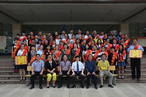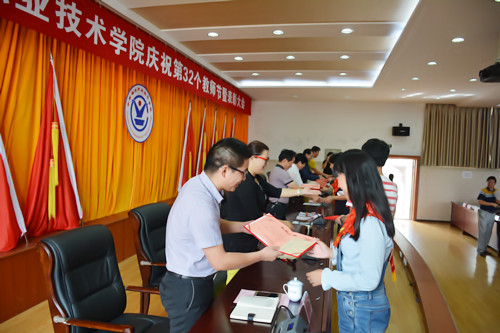 9月9日下午, 云南职业技术学院在新教学楼五楼报告厅隆重举行庆祝第32个教师节表彰大会,表彰我院2014-2015年度的先进集体(2个)、优秀教师、先进教育工作者、优秀班主任、优秀政治辅导员共计56名。党委书记黄梓嘉,院长李建波,党委副书记张家涛、纪委书记李蕾,副院长陈国华、曲向哲出席大会并为获奖教师颁奖。党委书记黄梓嘉主持大会。