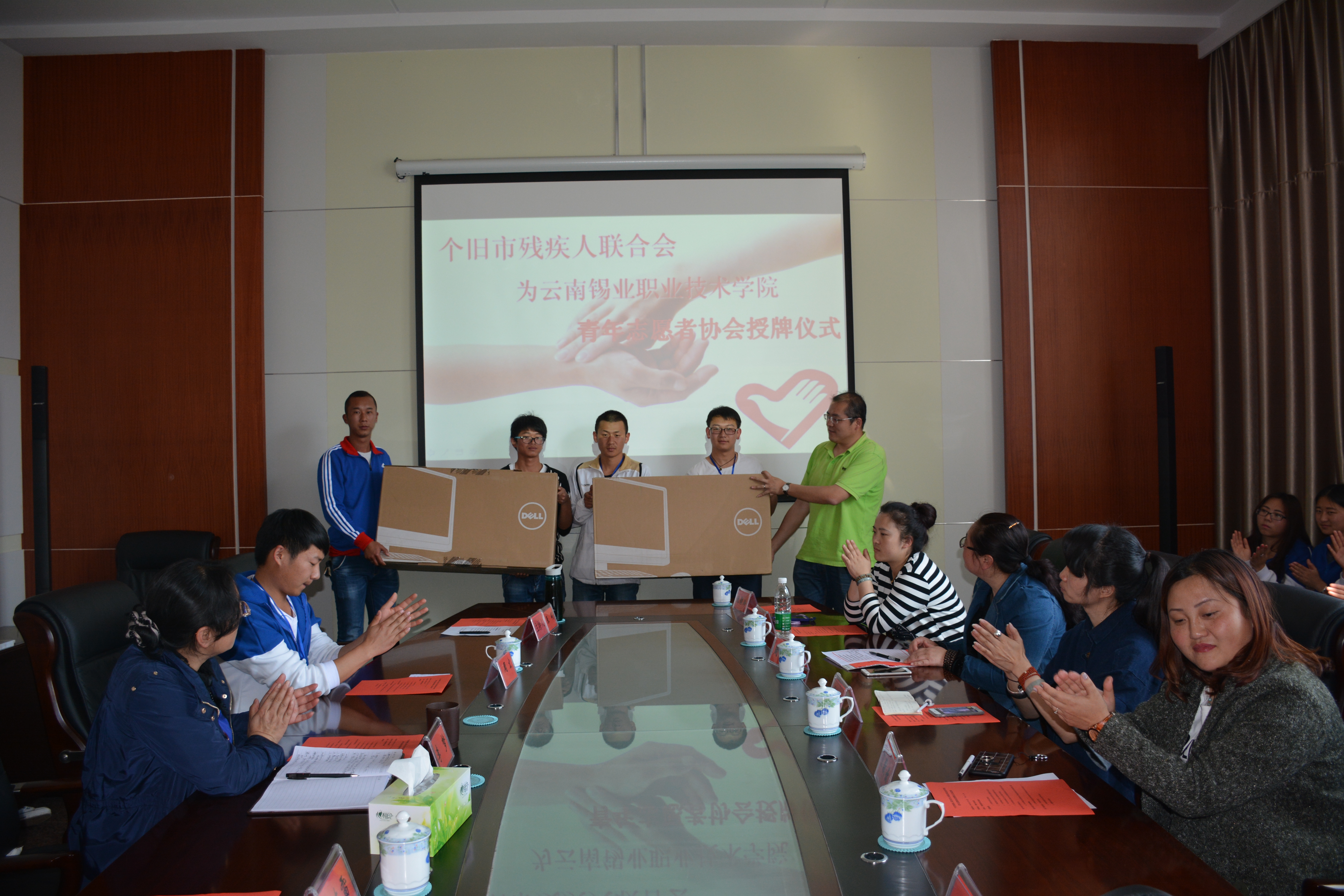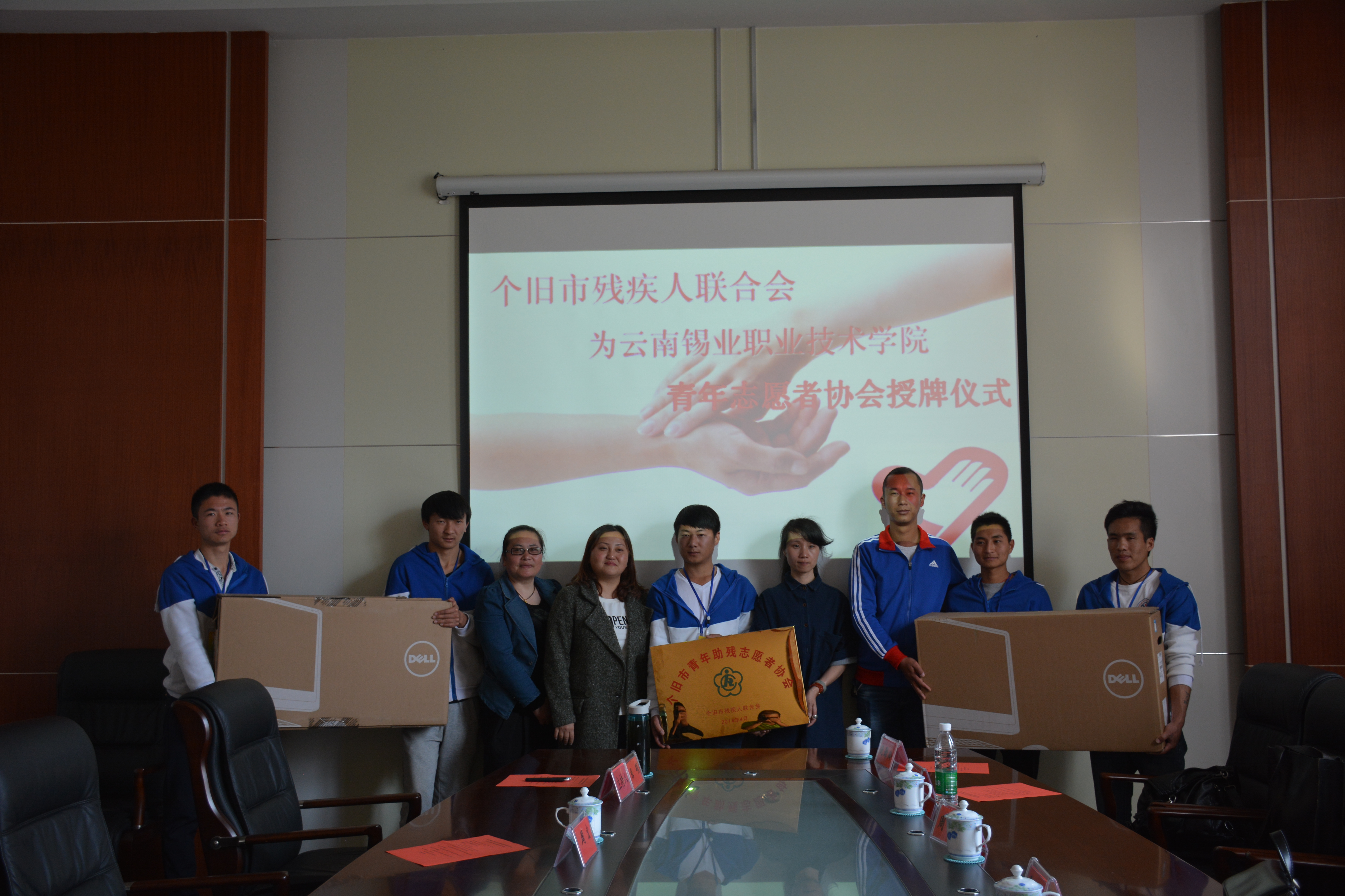 最后,个旧市残疾人联合会副理事长孙娅代表市残联向职业学院青年志愿者协会授牌,金湖南社区向青年志愿者协会赠送了2台电脑。