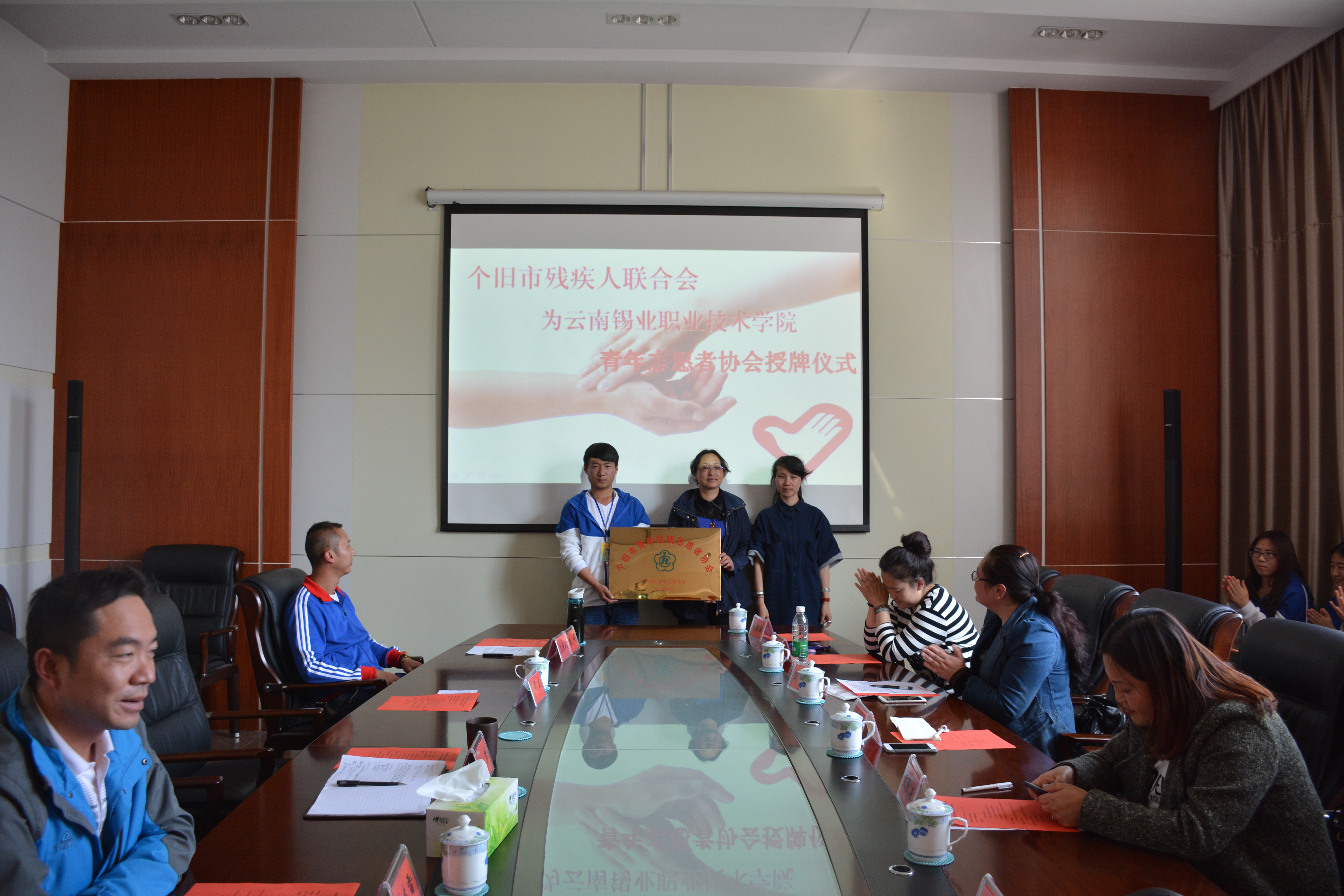 3月18日下午,个旧市残疾人联合会向云南锡业职业技术学院青年志愿者协会授牌。个旧市残疾人联合会副理事长孙娅、城区办民政科干事聂箐、金湖南社区主任王敬云、副主任周云仙、干事陆婷和学院党委副书记李梦、学生处处长曹友雷、学院学生会主席柘元鹏、学院青年志愿者协会会长周宏及部分社团代表参加授牌仪式,授牌仪式由学院团委书记张硕主持。