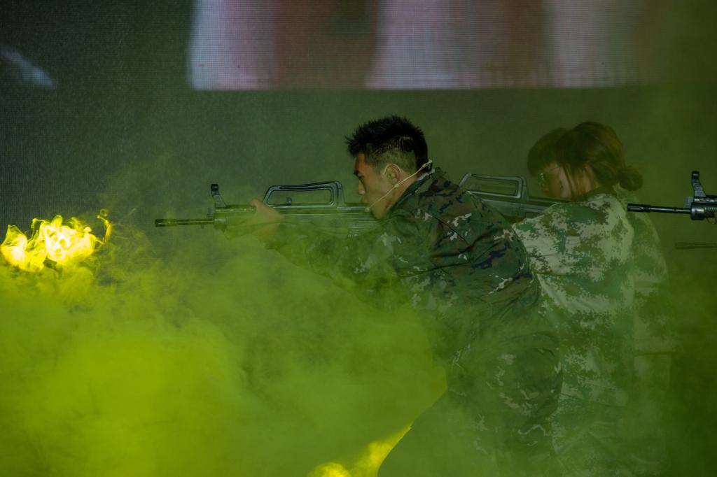 《雄鹰出击》将晚会推向高潮,再现了新生军训的场景,一招一式、一令一动,展现出青年学子军人般的飒爽英姿和坚韧意志。