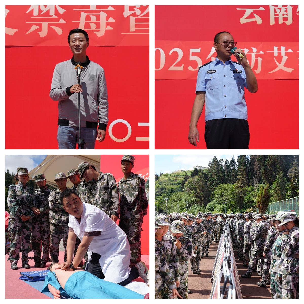 个旧市卫健局副局长、个旧市防艾局局长张毅结合实际案例,深入讲解了艾滋病的危害、传播途径及预防方法,引导同学们树立健康生活理念,增强自我保护能力。个旧市公安局民警则通过讲述新型毒品分类,结合真实案例,揭示了毒品及对个人、家庭的严重危害,警示同学们要坚决抵制诱惑,远离毒品侵害。个旧市锡城卫生院的医护人员现场演示了心肺复苏和海姆立克急救法,耐心指导学生实操并掌握基本急救技能。活动有效提升了学生的自我防护意识,强化了其心理韧性和积极品质,筑牢了防艾禁毒和重视心理健康的防线。