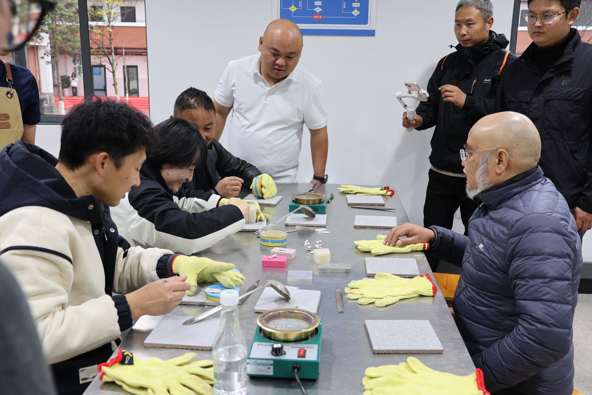 在锡工艺美术学院,协会成员与中国锡工艺美术大师赖庆国展开面对面交流。随后,大家走进工艺制作体验区,在专业人员指导下,体验浇注、抛光等基础工序。指尖与锡材相触的瞬间,传统技艺的温度与力量悄然传递。大家通过镜头全程记录了一件手工锡器从滚烫锡水到精美成品的蜕变过程,沉浸式感受锡文化魅力。