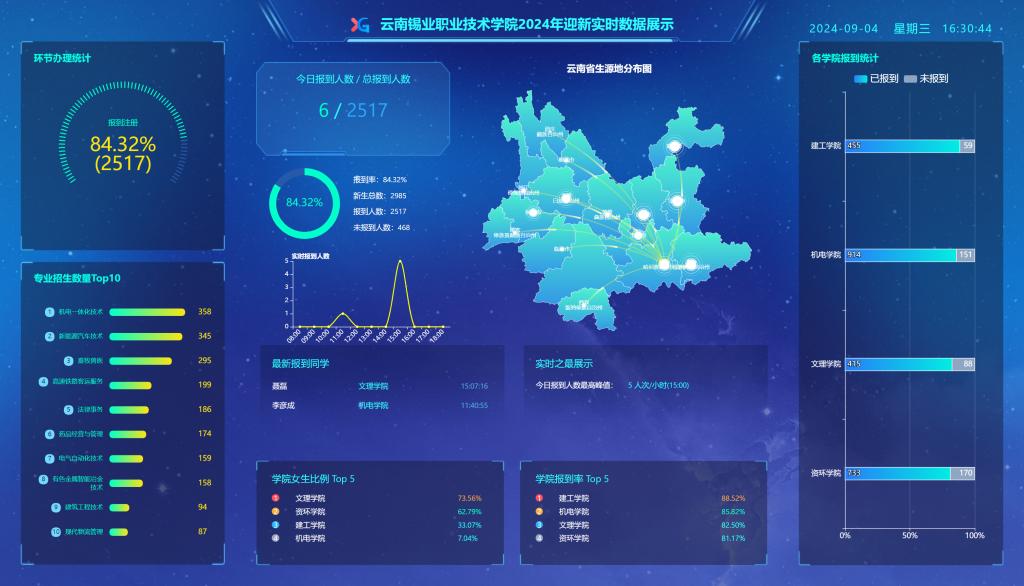 为方便2024级新生高效快捷地办理入学手续,学院简化现场报到流程,提升新生办理体验,以数字迎新为2024级新生开启专属崭新征程。入学报到前,将入学报到流程随录取通知书一并寄出,并发布至学院官方订阅号;报到前,新生即可完成宿舍床位选取,校方也可完成新生最全基础信息采集;报到当天,新生仅需到报到现场刷本人身份证即可完成报到确认,校方即可实时掌握新生报到涉及的生源地、各学院各专业报到人数等详细情况。数字迎新的全面实施,有效提高迎新工作的专业化水平和效率,极大提升了新生及家长的体验感和满意度。