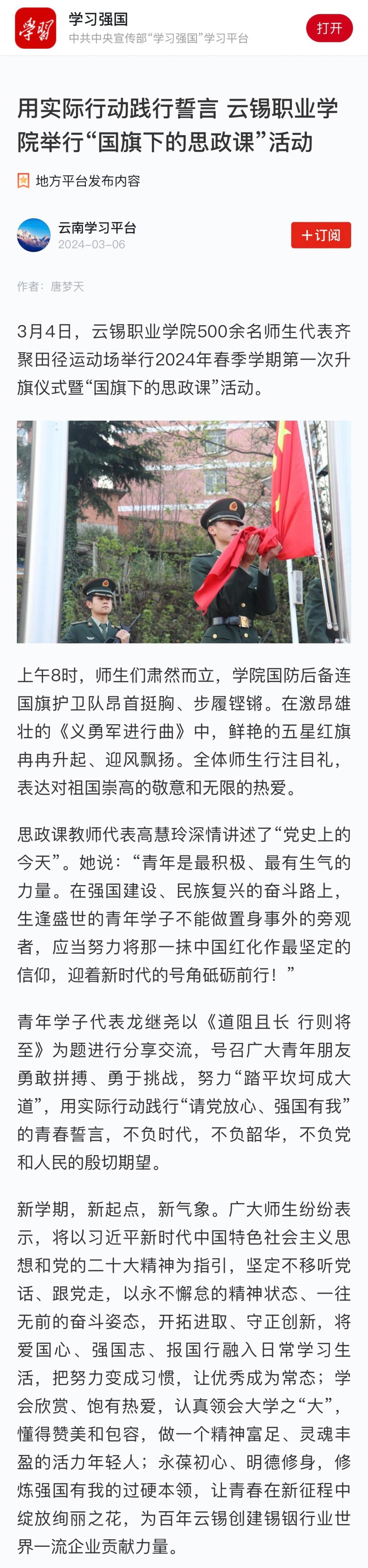 媒体关注|学习强国:用实际行动践行誓言 云锡职业学院举行“国旗下的思政课”活动