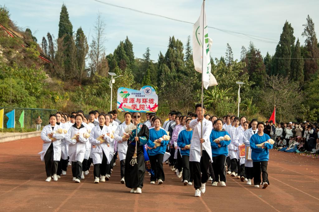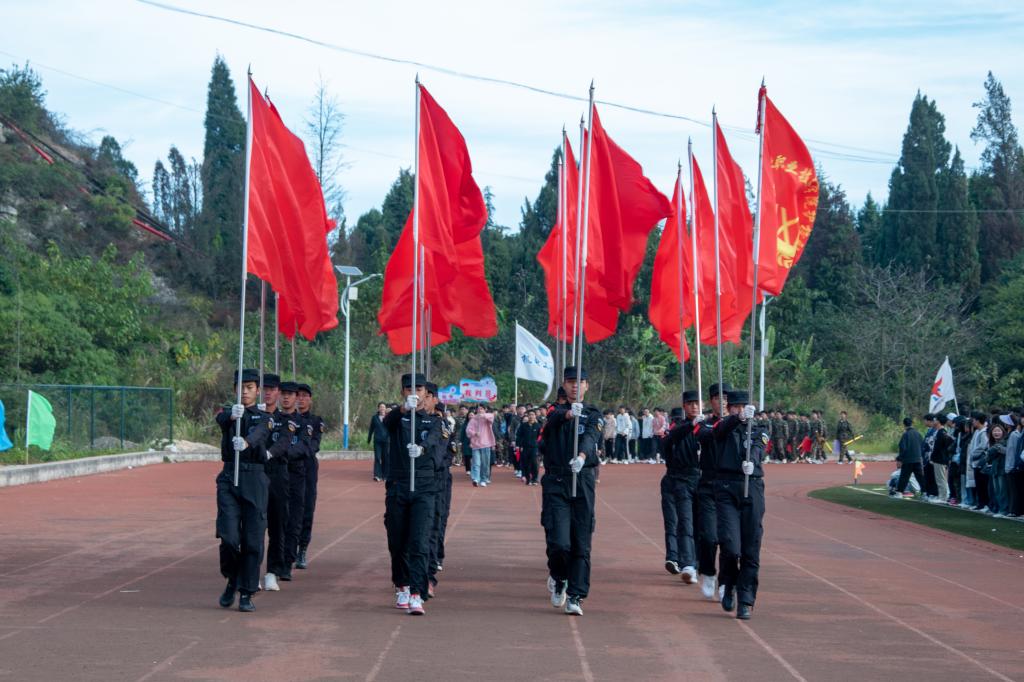 在《运动员进行曲》激昂的旋律中,英姿飒爽的护旗队迈着铿锵有力的步伐护送国旗、校旗走过主席台,各学院代表方队、裁判员代表队昂首阔步依次入场。