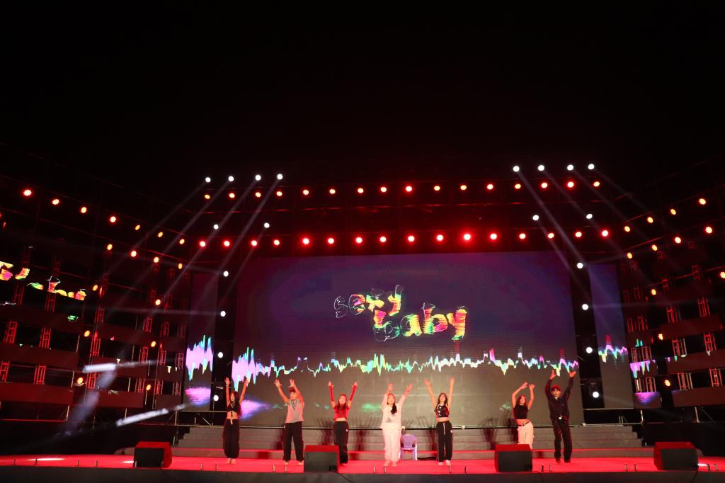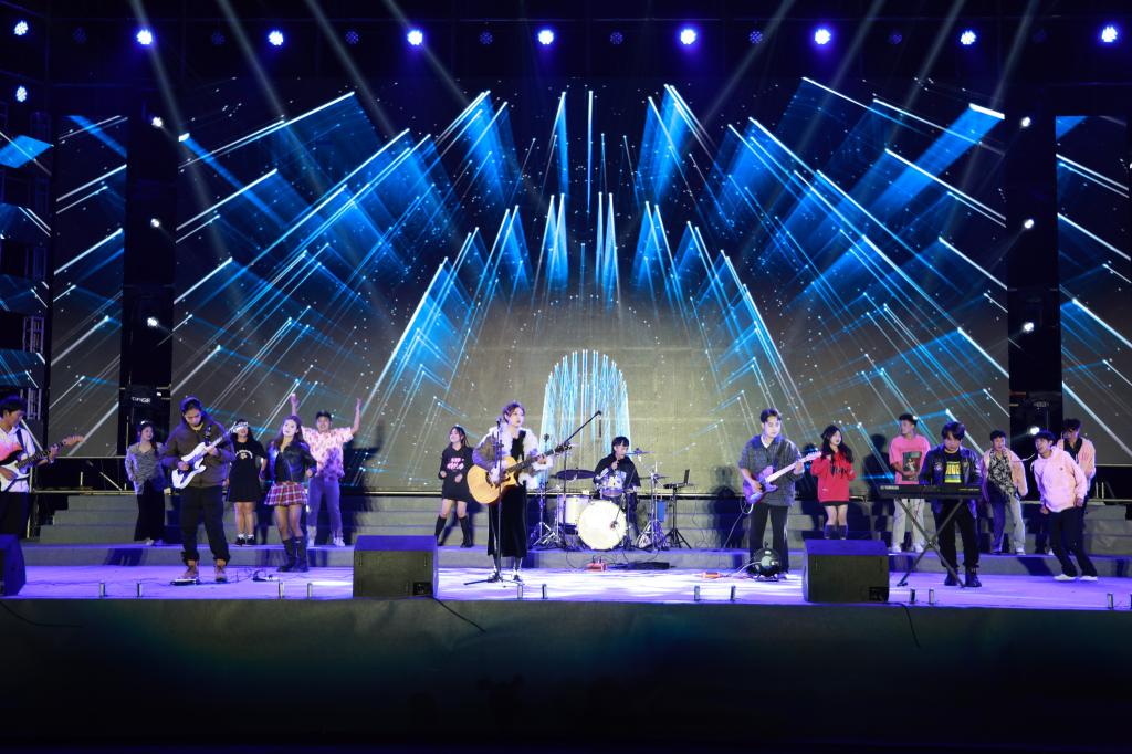 晚会在学院集音社和个旧市乾韵艺术培训学校师生超燃歌曲以及全场师生的欢呼声中正式拉开序幕,旋律激情澎湃,欢呼声回荡校园,瞬间点燃全场。