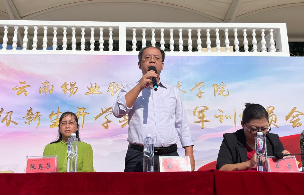学院党委副书记、院长李蕾致辞并作军训动员,她代表学院全体师生员工对2023级新生表示诚挚的欢迎!向锡业股份党群工作部以及全体教官表示最衷心的感谢!