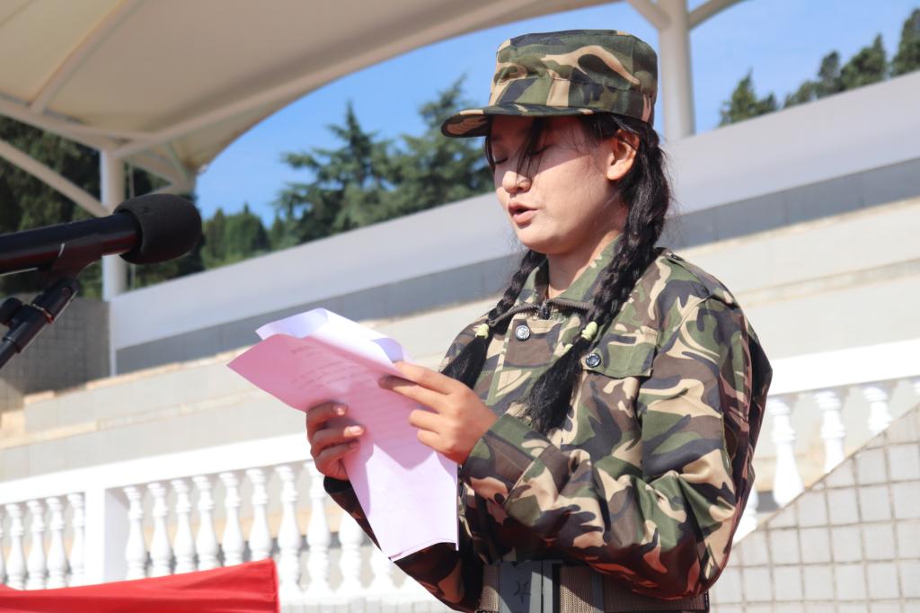最后,新生代表张俊甜发言,代表23级全体新生向领导、教官、老师们承诺:一切行动听指挥,以军人的身份严格要求自己,培养吃苦耐劳的品质,认真操练,努力完成规定的军训任务,培养好习惯、好作风、好品德,严格遵守各项纪律。