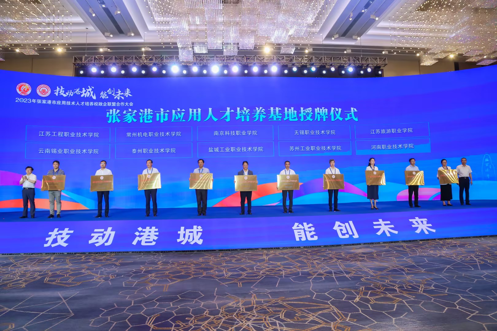 6月10日,张家港市举行“技动港城 能创未来”2023年应用技术人才培养校政企联盟合作大会,10批产业应用技术人才培养校政企联盟在会上签约。江苏省教育厅、人社厅及张家港市相关领导出席大会。职业学院党委副书记、院长李蕾受邀参加大会,代表学院签约冶金新材料产业应用技术人才培养校政企联盟,并接受应用人才培养基地授牌。