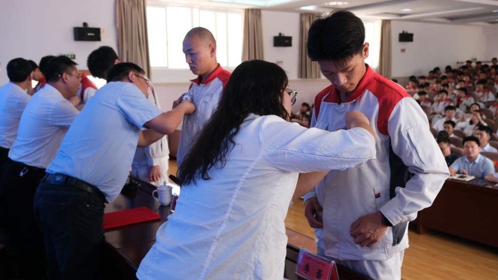 校企双方领导为学生代表佩戴“长城汽车产业学院”徽章,共同为云南锡业职业技术学院“长城汽车学院”揭牌。