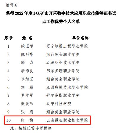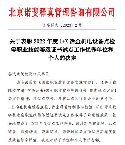 近日,北京诺斐释真管理咨询有限公司(教育部职业教育发展中心所确定的“矿山开采数字技术应用职业技能等级证书”的培训评价组织)发布了《关于表彰 2022 年度 1+X 冶金机电设备点检等职业技能等级证书试点工作优秀单位和个人的决定》,学院被评为“2022 年度1+X 矿山开采数字技术应用职业技能证书试点工作优秀单位”,资源与环境学院张梅老师被评为“2022 年度1+X 矿山开采数字技术应用职业技能证书试点工作优秀个人”。