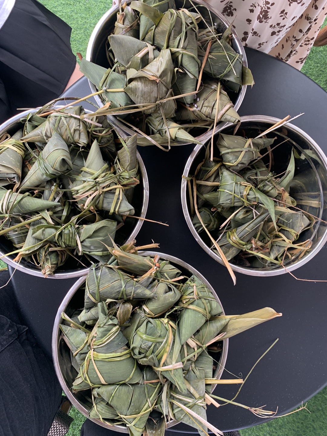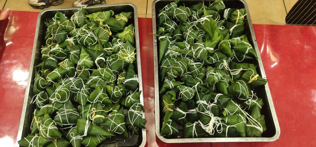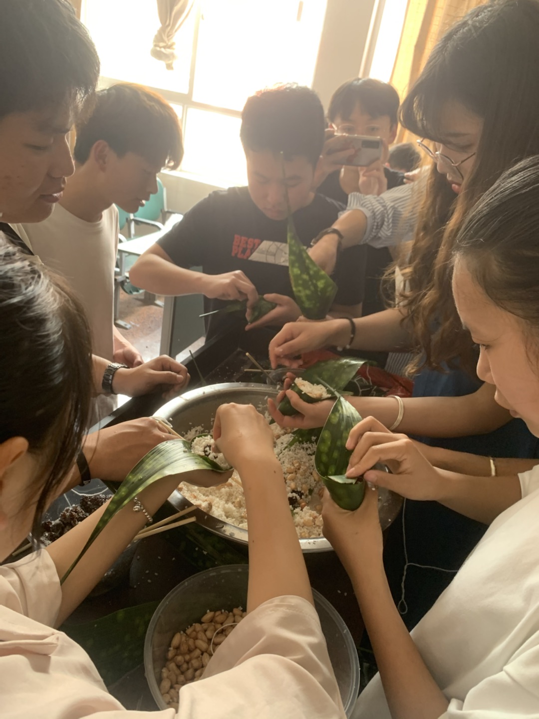 包粽子过程中,有的同学动作麻利,将粽子叶卷成漏斗状后,用糯米充实压紧,再用细绳打个结,转眼间就包出了一个个可爱的小粽子。也有些同学因为没有经验,绳子还没来得及捆,粽子叶就散了,糯米洒了一桌,引来笑声阵阵。当棕子煮好后,形状各异却充满竹叶香的粽子让人垂涎,同学们纷纷将热腾腾的粽子送给了老师和校友,并祝愿端午节的快乐。