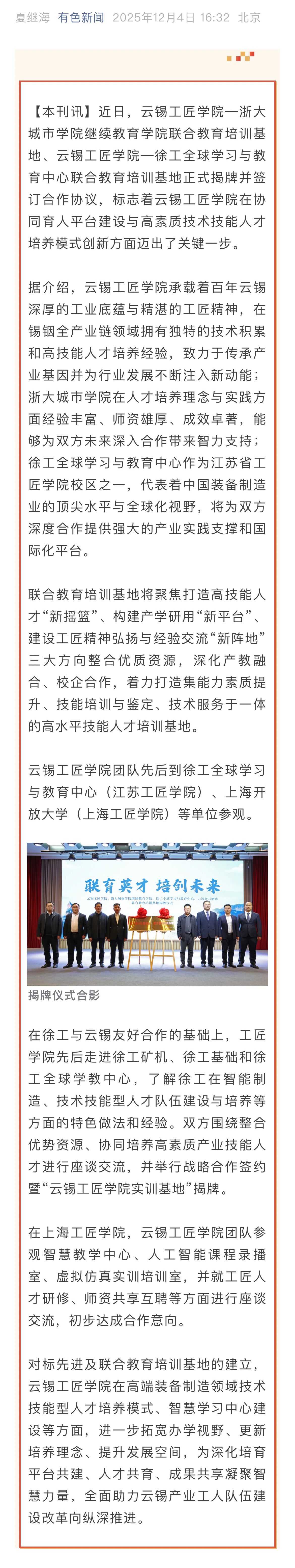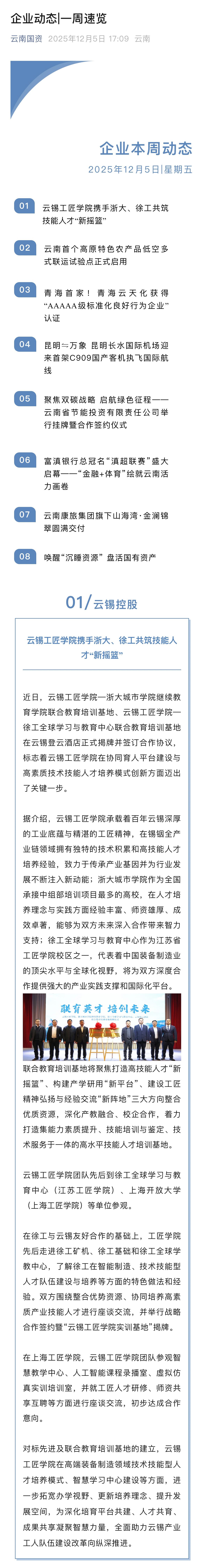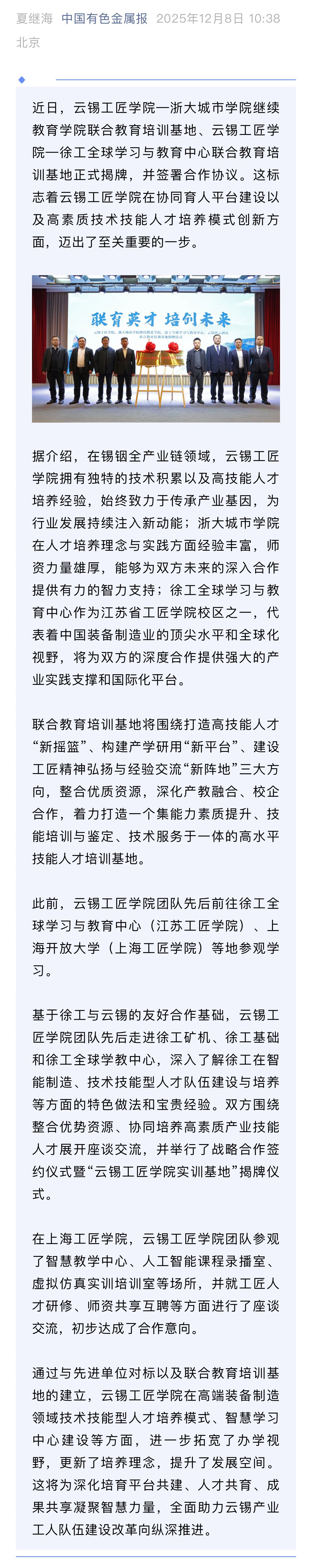 云南国资、中国有色金属报、有色新闻:云锡工匠学院携手浙大、徐工共筑技能人才“新摇篮”