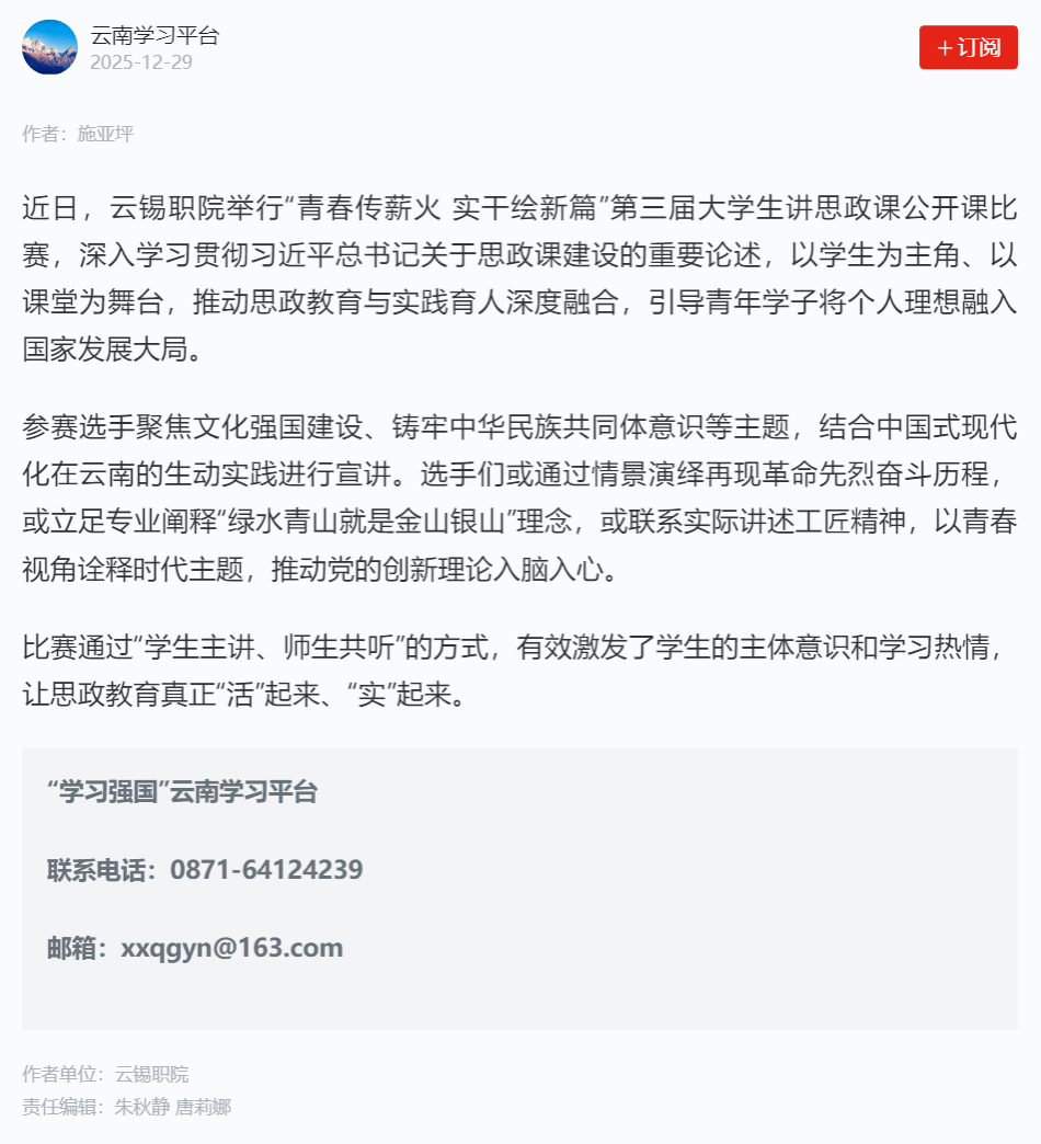 学习强国:云锡职院青春传薪火 实干绘新篇
