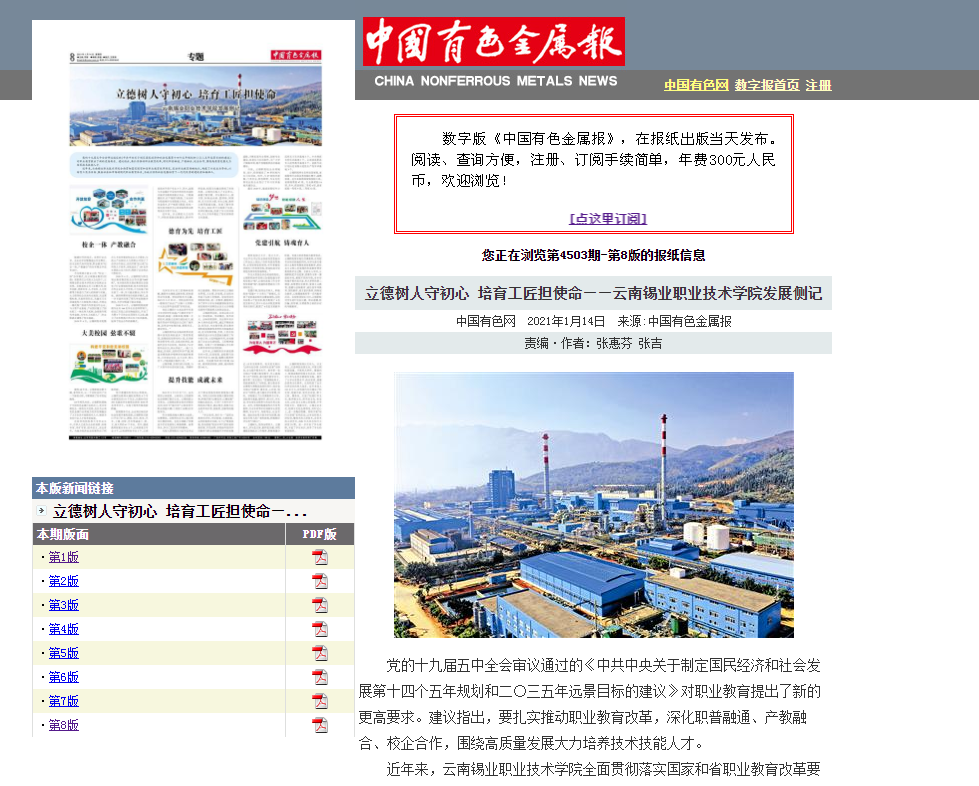 2020年5月15日,姚家立检查指导学院返校复学工作2020年5月16日, 学院首批学子有序返校2020年5月29日,省工艺美术协会红河传承基地在云锡职院举行授牌2020年6月4日,昆明工职院到云锡职院交流办学工作2020年6月11日,个旧市疾控中心招募新冠疫苗临床试验志愿者2020年9月 11日,学院召开教师节表彰会议并隆重庆祝第36个教师节2020年9月8日,李蕾检查指导学院秋季开学和疫情防控工作2020年9月28、29 日,终于等到你:学院迎来2020...