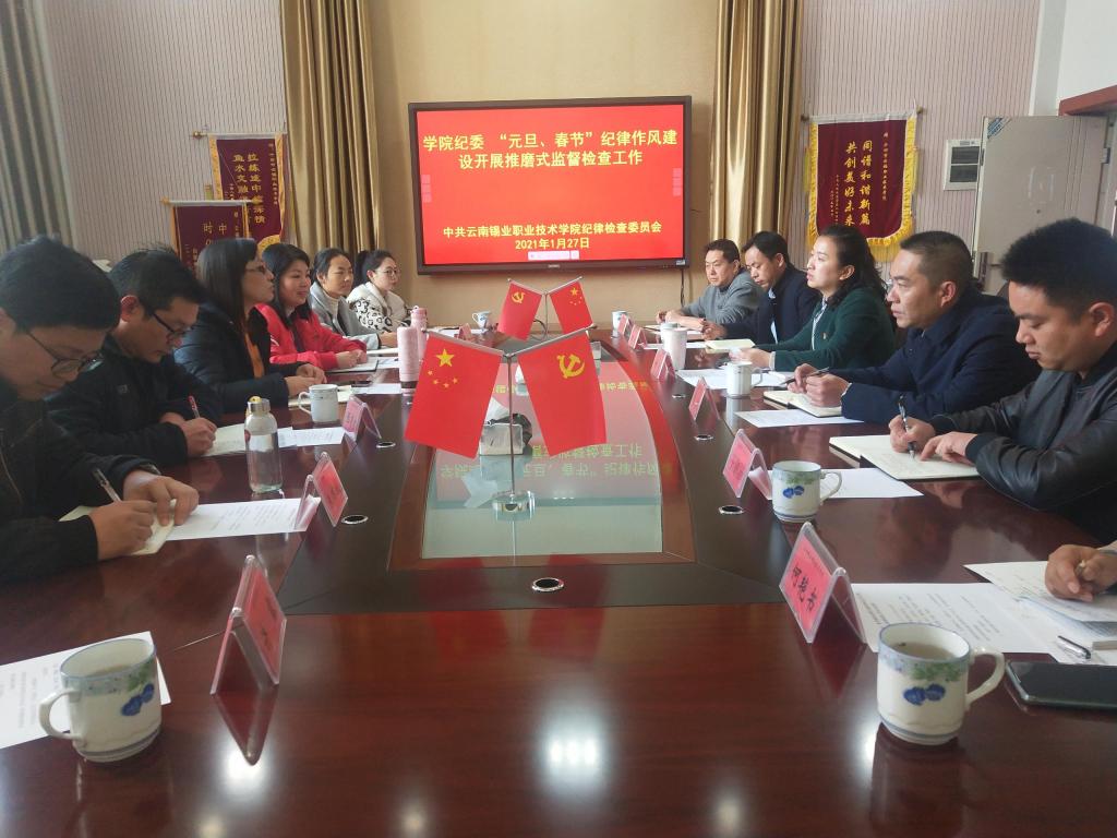 1月27日,云锡研究院公司党委副书记、纪委书记、工会主席马明仙带队到云锡职院,对学院2021年元旦、春节期间纪律作风建设情况进行交叉式推磨式监督检查。学院党委副书记、工会主席、纪委书记刘青汇报了学院党风廉政建设工作情况。检查组以听汇报、找谈话、查台账等形式开展交叉式推磨式监督检查,进一步严明纪律,严格落实中央八项规定精神,净化节日风气,强化监督执纪问责,深入纠治“四风”。检查组重点抽查了学院党委会纪要...